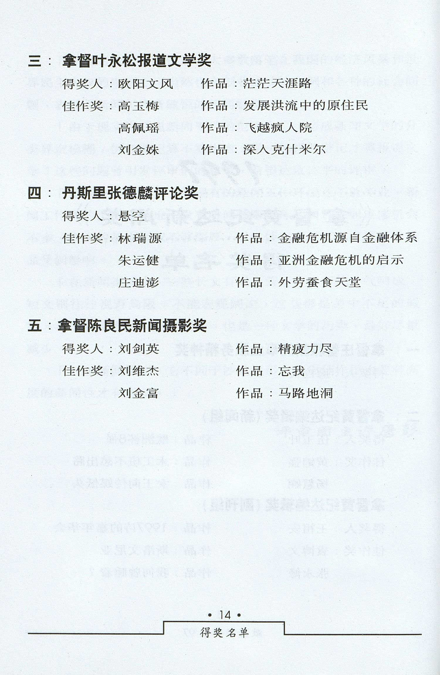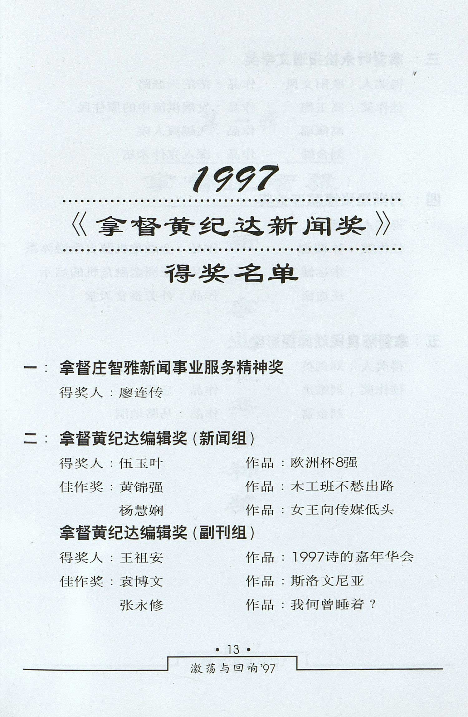 1997年度黄纪达新闻奖得奖名单