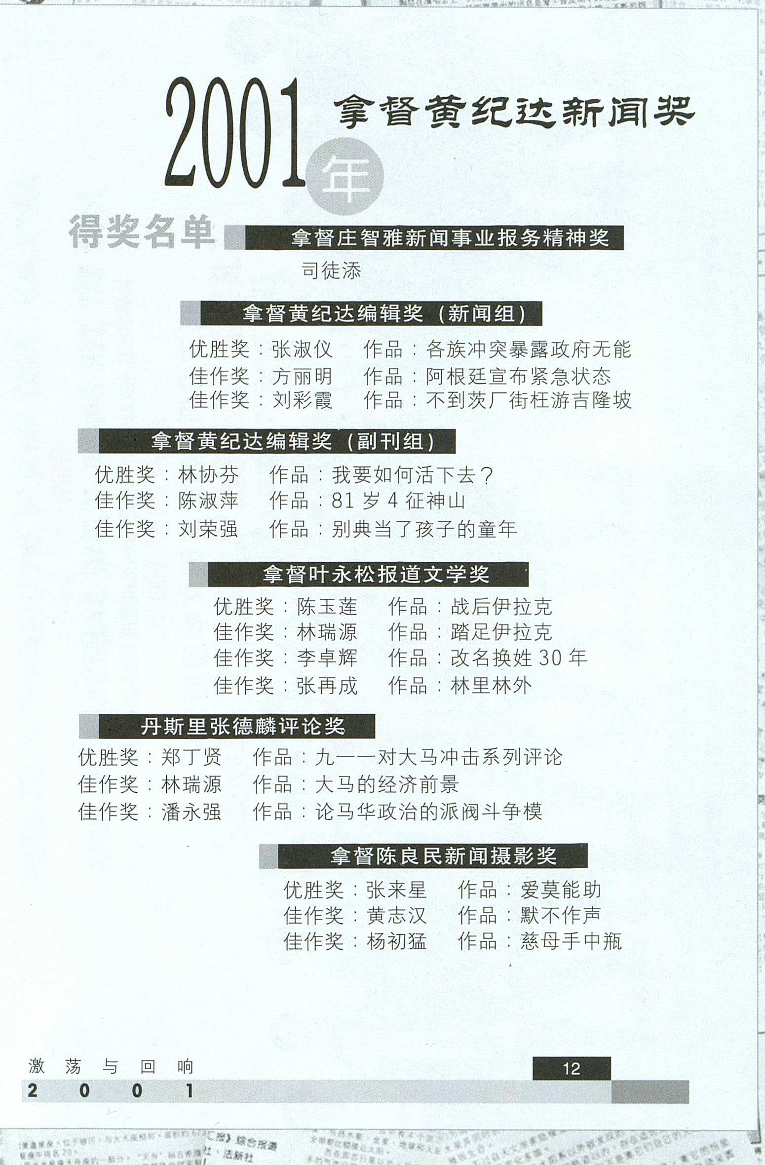 2001年度黄纪达新闻奖得奖名单