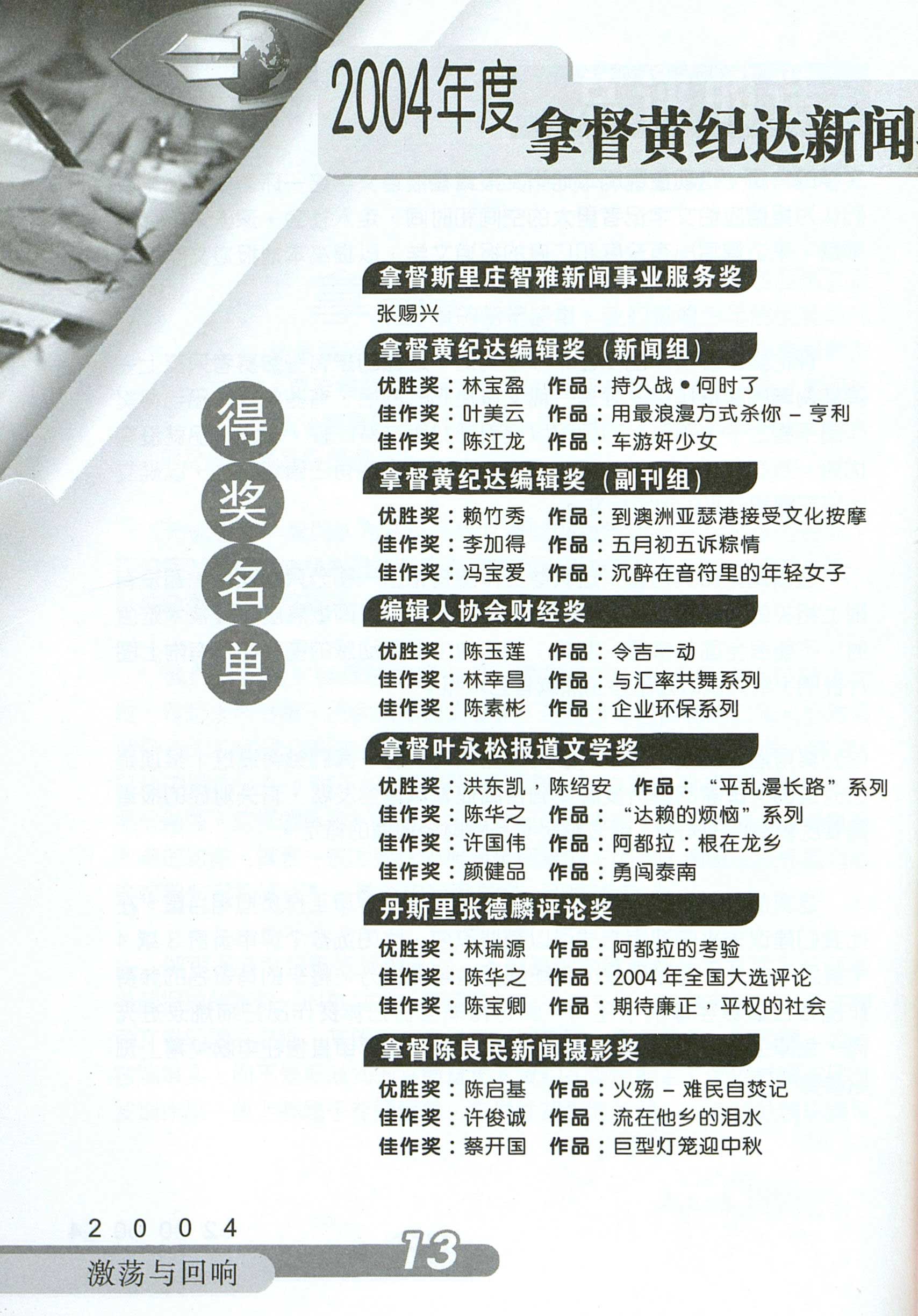 2004年度黄纪达新闻奖得奖名单