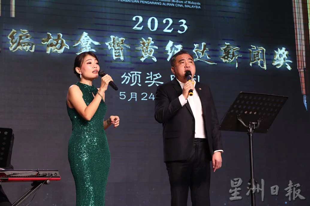 (八打灵再也25日讯)交通部长陆兆福再次展现歌喉,在2023年度编协拿督黄纪达新闻奖颁奖礼上,演唱香港殿堂级摇滚乐团Beyond名曲《海阔天空》。