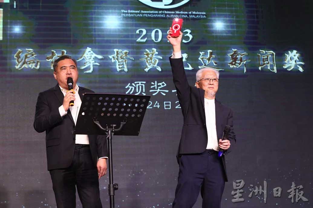 (八打灵再也25日讯)交通部长陆兆福再次展现歌喉,在2023年度编协拿督黄纪达新闻奖颁奖礼上,演唱香港殿堂级摇滚乐团Beyond名曲《海阔天空》。