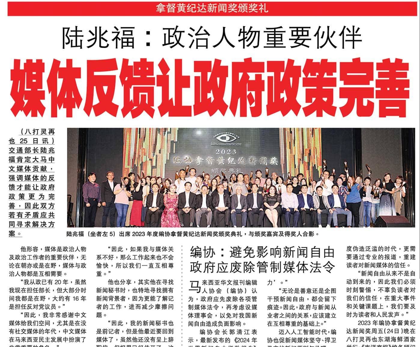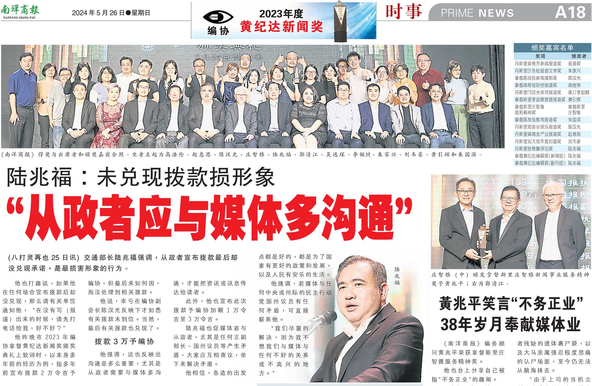 (八打灵再也25日讯)《南洋商报》在2023年度编协黄纪达新闻奖斩获4份佳作奖,而本报编务顾问黄兆平则获得拿督斯里庄智雅新闻事业服务精神奖。
