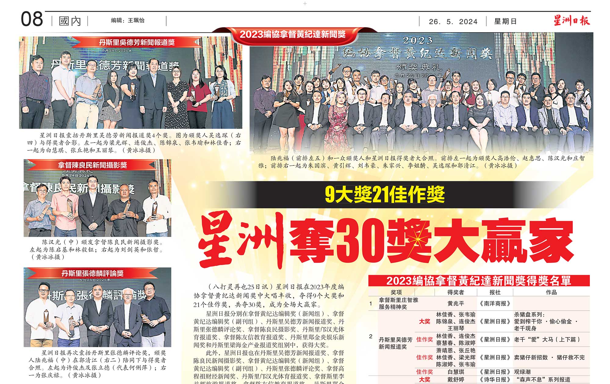 (八打灵再也25日讯)星洲日报在2023年度编协拿督黄纪达新闻奖中大唱丰收,夺得9个大奖和21个佳作奖,共夺30奖,成为全场大赢家。